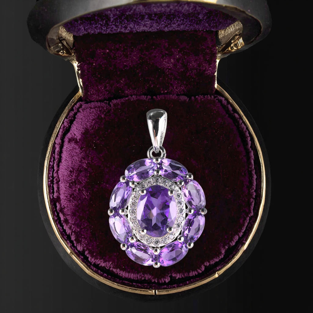 Crafted with rhodium-plated 925 sterling silver and a natural amethyst stone, this classic pendant features an elegant oval cut and claw setting, perfect for anniversaries and women seeking timeless beauty. With over 25 years of expertise, the manufacturer ensures high-quality craftsmanship, personalized services including logo customization, and efficient delivery options.